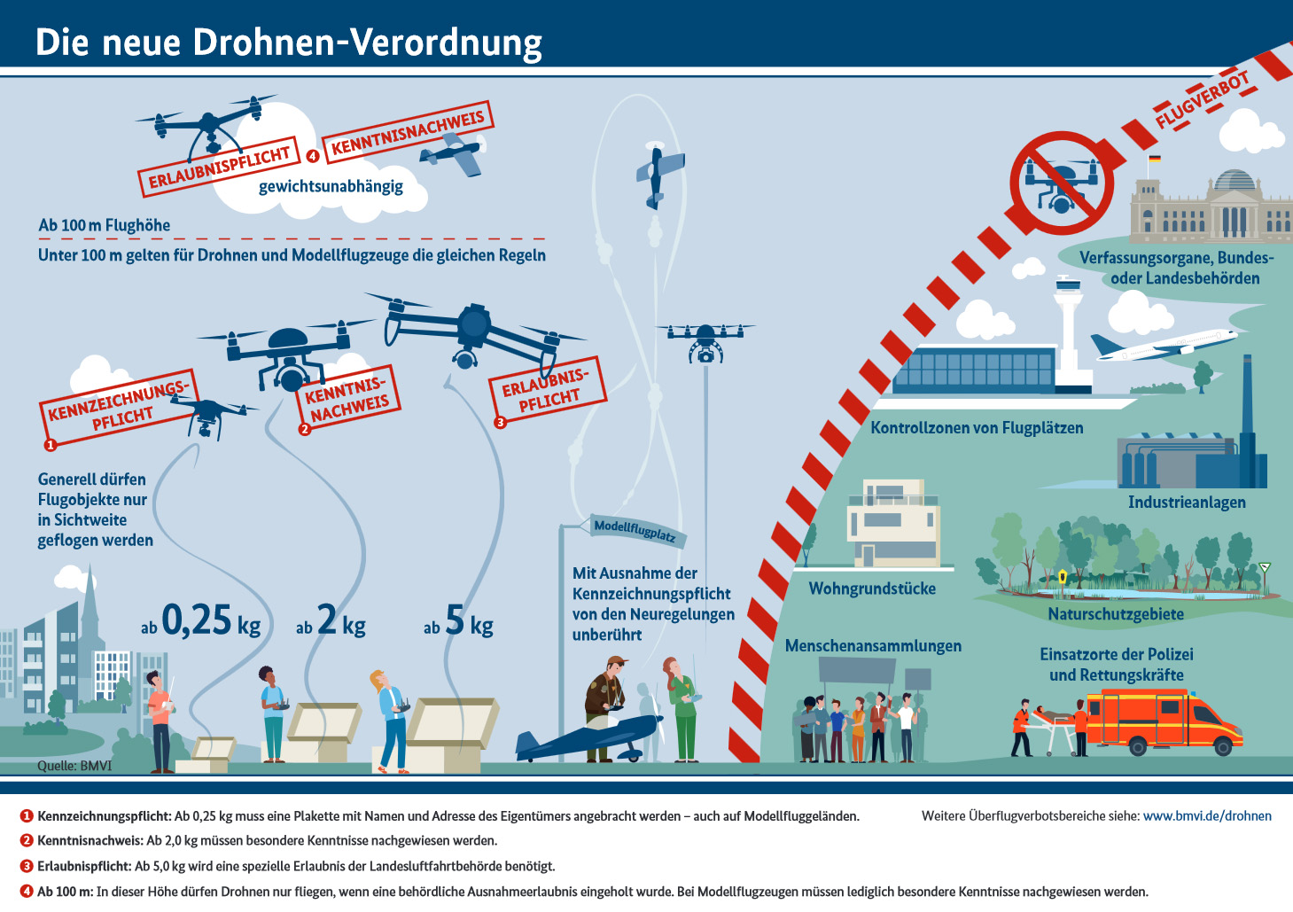 Atomkraftwerke, Regierungsviertel, Industrieanlagen, Wohngebiete, Menschenansammlungen, Unfallstellen, Katastrophengebiete und militärische Anlagen sind ebenfalls Flugverbotszonen. Die einzelnen Bundesländer besitzen uneinheitliche Bestimmungen. Eine generelle Flugverbotszone für Drohnen besitzt Hamburg, Hobbypiloten müssen in Berlin fast cityweit eine Genehmigung für den Aufstieg beantragen. Ebenfalls sind große Teile des Stadtgebiets von Düsseldorf, Köln, Dortmund, Hannover, Leipzig, Frankfurt und Dresden Flugverbotszonen. Besonders strenge allgemeine Bestimmungen herrschen in den Bundesländern Baden-Württemberg und Rheinland-Pfalz sowie in den Stadtstaaten Berlin, Bremen und Hamburg.